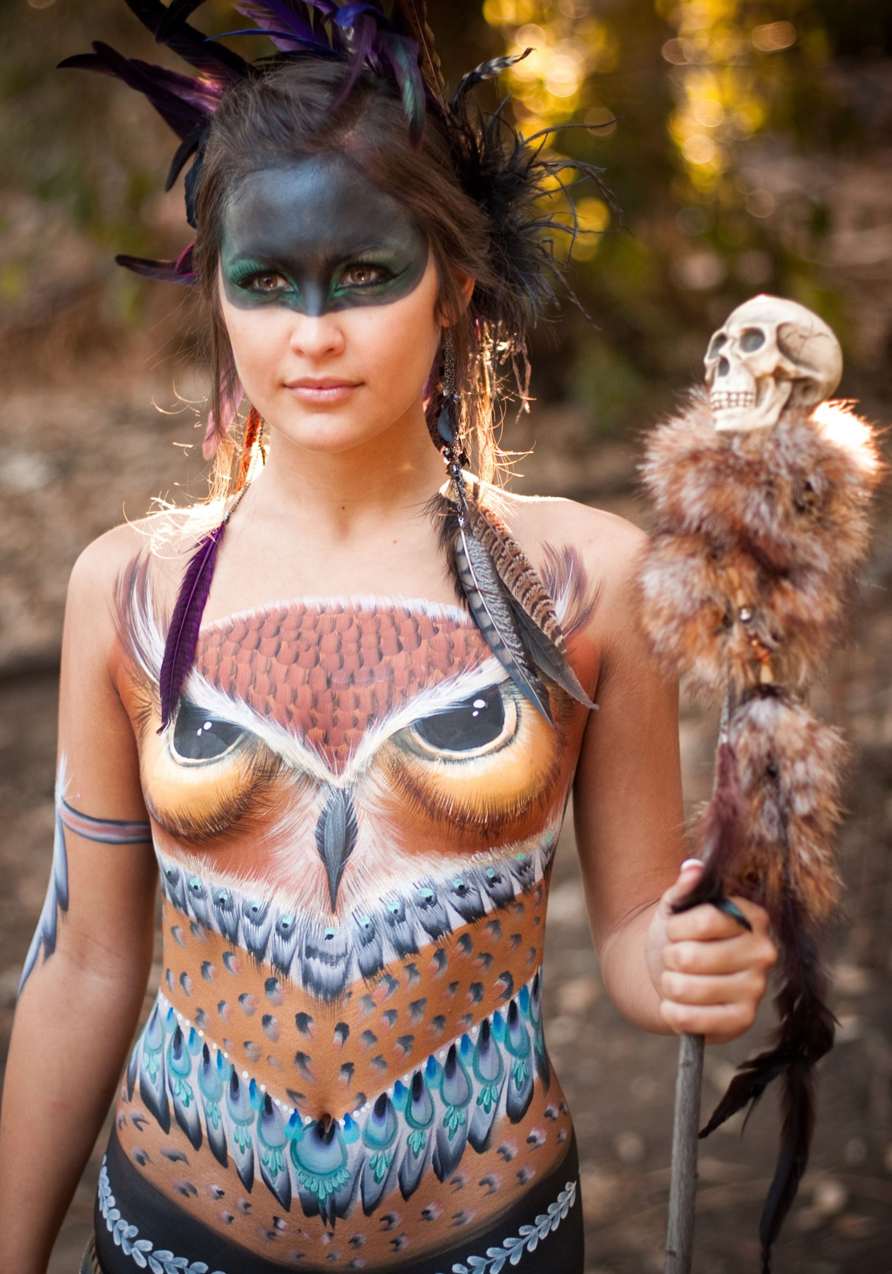 Try observing the environment to find someone whose face is covered by dark paint. Additionally, where is the bird shown? It appears as if another person is looking over their shoulder. This body art is even more remarkable due to the mystery of its creation.
